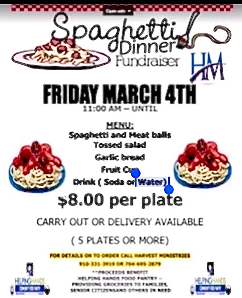 Harvest Ministry is having a Spaghetti Dinner Fundraiser, March 4th, 2022.
